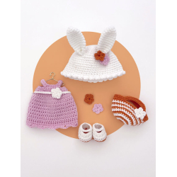 Grâce à cette pochette, vous pourrez habiller et accessoiriser votre poupée Lulu avec une jolie robe rose, une ceinture fleurie, un bonnet de lapin et ses oreilles, des sandales et un sac.