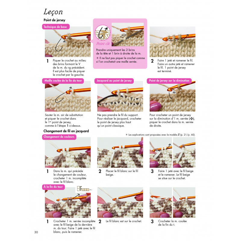 De plus, elle offre des tutos photos pour apprendre certaines techniques : point de jersey, Jacquard intarsia au crochet, changement de fil en Jacquard…