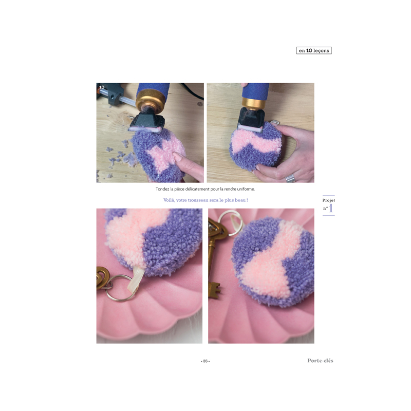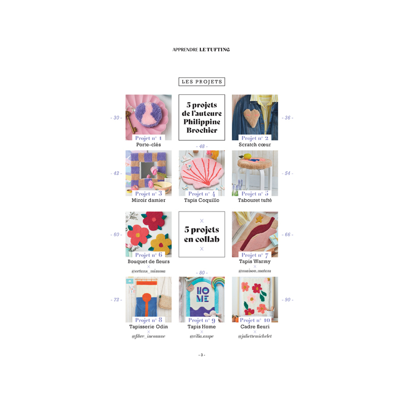 Soit 10 créations expliquées en pas à pas photos et en tutos vidéo pour vous garantir de réussir facilement votre premier projet en tufting !