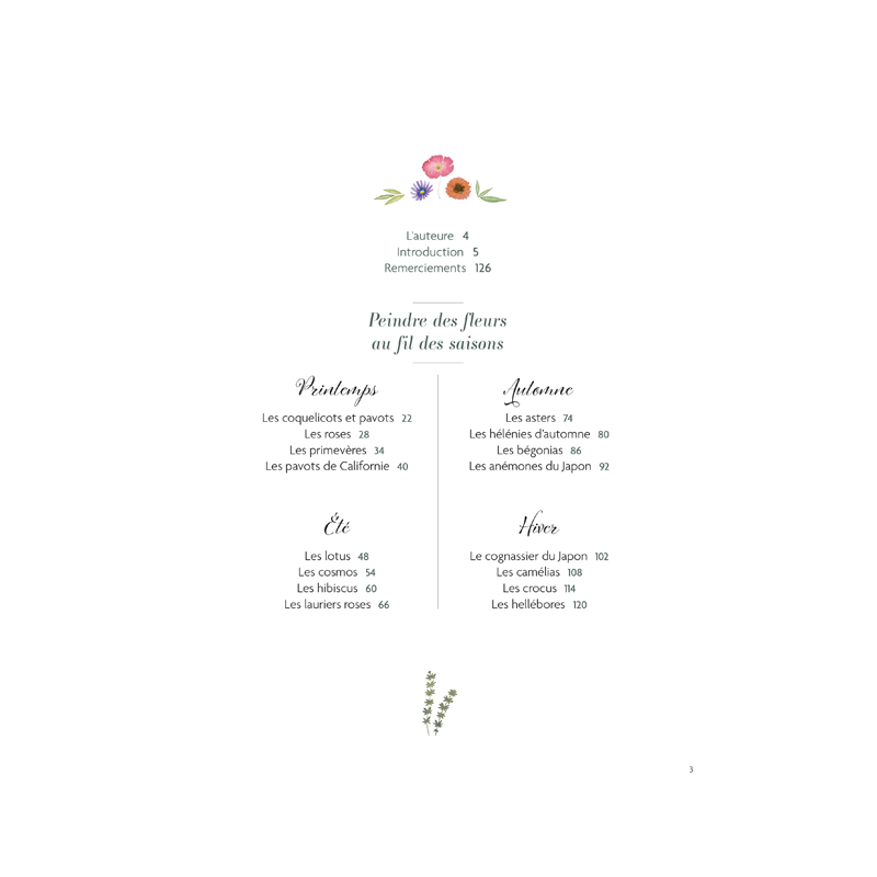Au fil des 128 pages de ce livre aquarelle, vous découvrirez pour chaque saison des palettes de couleurs, des planches d’inspirations et 4 compositions originales :