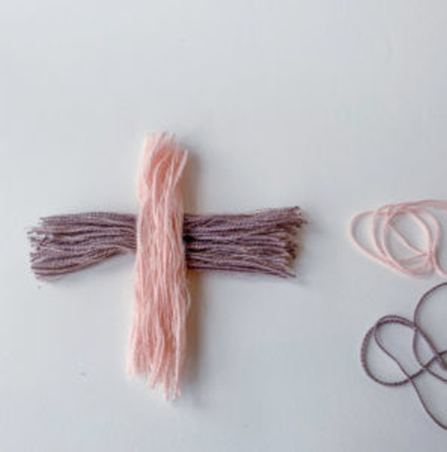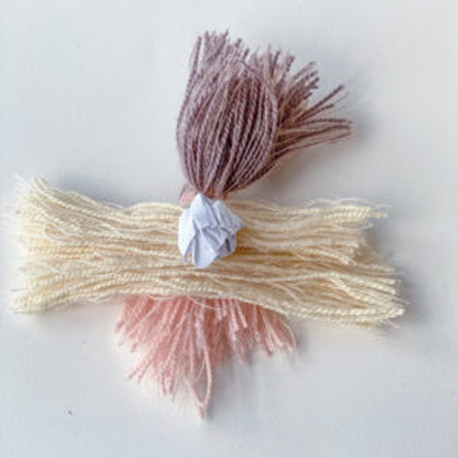 Par exemple, réunissez des restes de laine de 3 coloris différents. Enroulez-les autour d’un carton d’une dizaine de centimètres. Ensuite, coupez chaque coloris de laine de chaque côté du carton pour obtenir 3 “pelotes”. Prélevez quelques brins de chaque couleur.