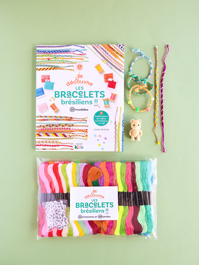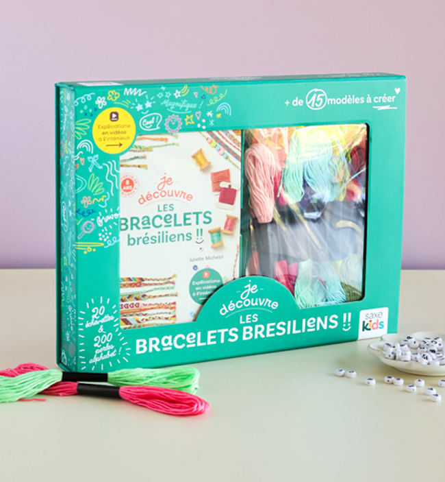 - Le coffret DIY “Je découvre les bracelets brésiliens” contenant tout ce qu’il faut pour commencer sans attendre ce loisir créatif enfant : matériel, + de 15 modèles trop stylés…