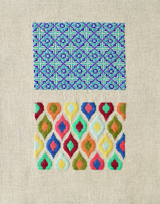 Brodeuse passionnée s’inspirant de ses nombreux voyages à travers l’Europe et l’Asie, elle propose une version revisitée de la broderie au point de Bargello :