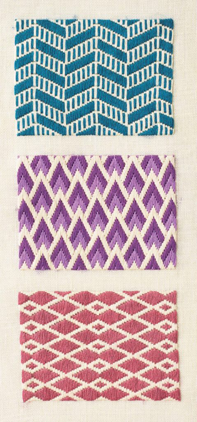 Et côté motifs ? Il n’est pas question de broder des motifs figuratifs comme c’est le cas pour la peinture à l’aiguille. Avec le Bargello, vous réalisez des motifs géométriques au rendu graphique particulier (souvent en zigzag), en jouant sur les couleurs des fils, la longueur des points…