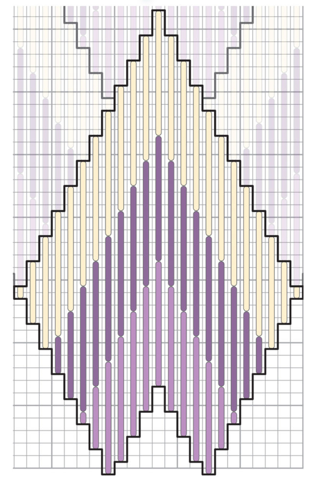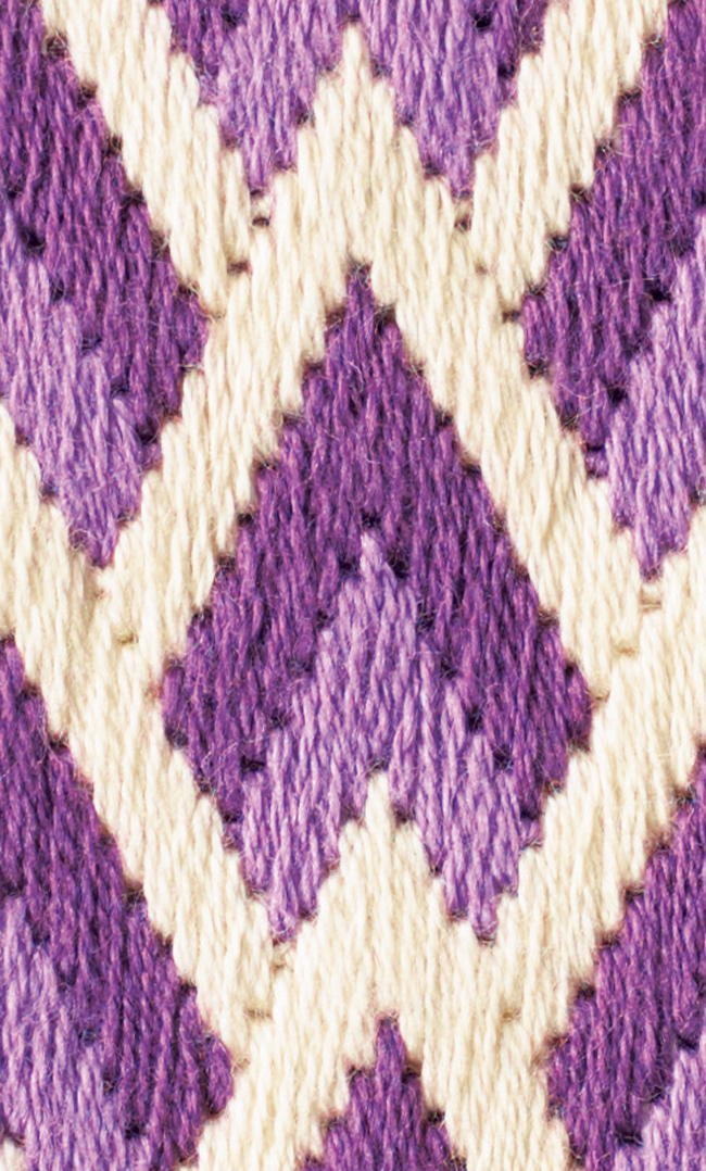 Pour réaliser chaque point, sortez l’aiguille au centre d’un carré. Comptez le nombre de fils de trame (horizontaux) indiqué sur la grille, puis piquez l’aiguille au centre du carré supérieur. Vous piquerez l’aiguille 2 fois dans un même carré lorsqu’il y a un changement de couleur (violet et blanc sur la grille).