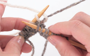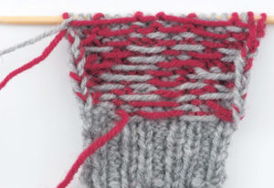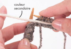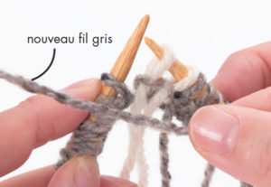 - Après avoir tricoté le 1er rang en gris, tricotez 9 mailles endroit avec le même fil gris. Au changement de couleur, laissez-le en attente. Tricotez les 2 mailles suivantes avec le fil écru.