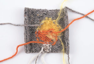 - Au 11e rang par exemple, croisez le fil jaune et le fil gris pour tricoter jusqu’au bord du rang avec le fil gris.