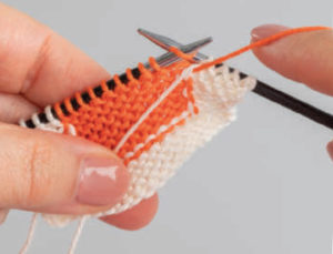 - Continuez à tricoter de la même manière en croisant les fils à chaque changement de couleur.