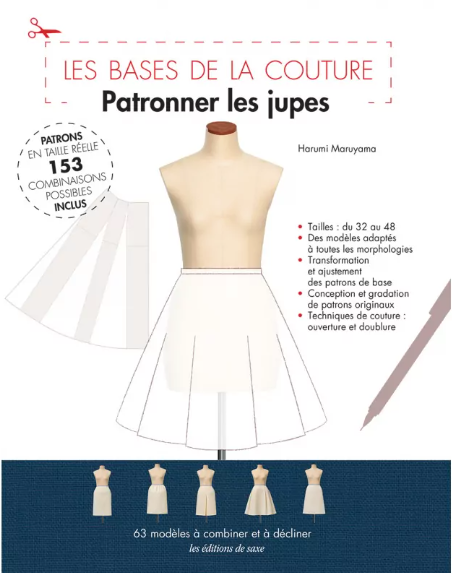 Vous aimez cette jupe portefeuille minimaliste et vous avez envie de coudre d’autres pièces du même style ? Vous en trouverez dans le livre paru aux éditions de saxe “Les bases de la couture : Patronner les jupes“ !