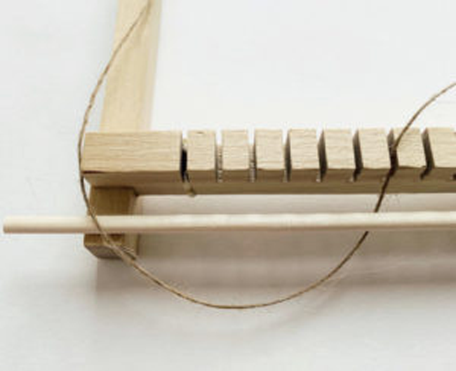 Préparez votre métier à tisser. Voici une manière de procéder : placez une tige de bois en haut et en bas du métier à tisser, sur l’extérieur. Après avoir noué le fil de chaîne sur la tige du haut, tendez-le jusqu’à la tige opposée. Passez le fil de chaîne dans la première fente du cadre inférieur, puis par-dessus la tige. Ensuite, passez-le dans la fente suivante et tendez-le bien jusqu’en haut. Continuez ainsi jusqu’au bout du cadre, nouez le fil et coupez l’excédent.