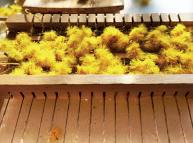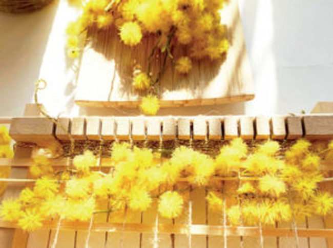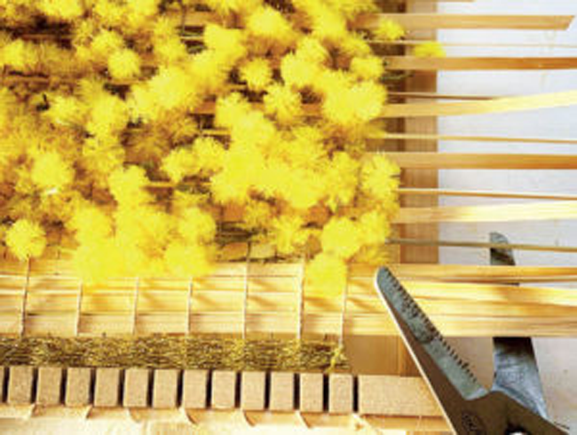 💡 Bon à savoir : vous pensez que seules les variétés qui fleurissent au printemps et en été peuvent entrer dans la composition d’un tissage végétal ? Non ! La nature vous offre au fil des saisons des ressources utilisables en loisirs créatifs. Pensez aux feuilles, mousses et autres végétaux tout aussi décoratifs pour être tissés. Avec ses lumineuses boules jaunes, le mimosa d’hiver est un choix idéal pour mettre du soleil dans votre déco d’intérieure à l’heure des premiers frimas hivernaux ! Par contre, mieux vaut le travailler tant qu’il est frais. En effet, il sèche très bien, mais il devient très cassant et donc difficile à manipuler une fois sec.