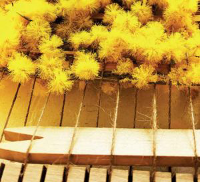 À l’aide du peigne, serrez bien le mimosa avant de tisser une nouvelle ligne. Utilisez la navette pour vous aider à insérer plus facilement les tiges de mimosa et tassez bien avec le peigne à chaque rangée. Insérez une nouvelle tige de bambou. Puis continuez jusqu’en bas en alternant des tiges de bambou et de mimosa.