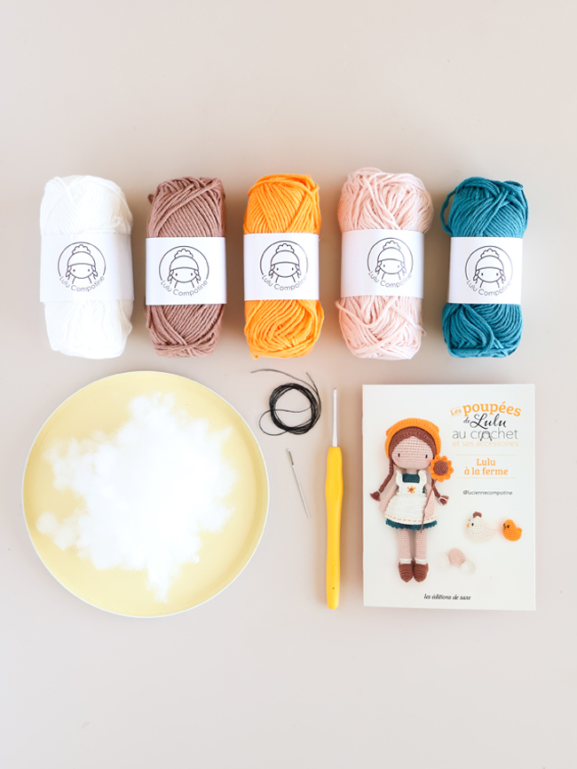 En effet, il s’agit d’un kit crochet contenant le matériel indispensable pour crocheter une poupée inédite en tenue de fermière accompagnée d’accessoires tout aussi mignons. Ces projets sont simples à réaliser grâce au livret fourni détaillant les bases à connaître et le tutoriel photos des modèles. Alors, n’attendez pas !