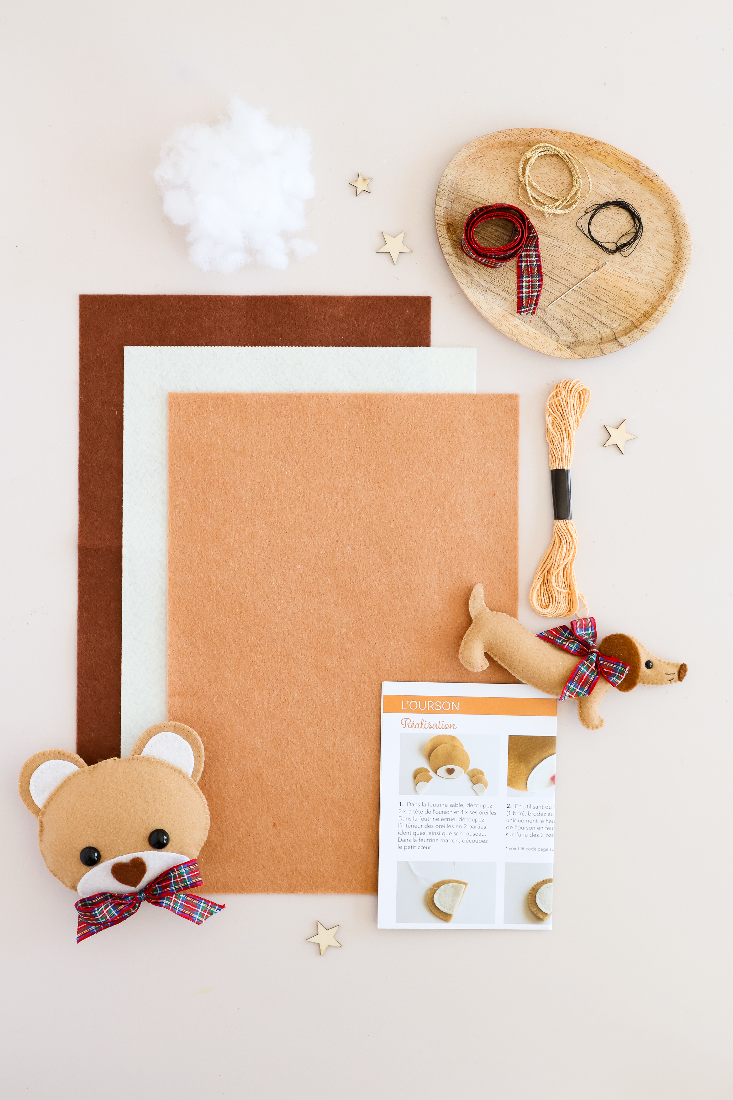 Créatrice renommée dans l’univers du DIY, Léa Louvet @touslesmotsdoux vous invite à créer un ourson attachant et un irrésistible teckel. Il s’agit de compagnons hyper chics à suspendre dans votre sapin pour apporter une touche créative à votre ambiance festive. Ce sont également des projets fait-main faciles à confectionner. En effet, il suffit d’utiliser le matériel fourni dans ce kit feutrine (feuilles de feutrine, fils, ouate…) et de suivre les instructions en photos pas à pas proposées pour réussir ces ravissantes décorations de Noël en feutrine !