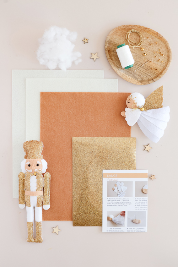 En effet, cette pochette contient non seulement le matériel (feuilles de feutrine, fils, embellissements…), mais également les tutos en photos pas à pas de 2 projets DIY simples à réaliser. Vous allez tomber sous le charme de ces modèles emblématiques des fêtes de fin d’année : un ange de Noël accompagné de l’incontournable Casse-Noisette à suspendre.