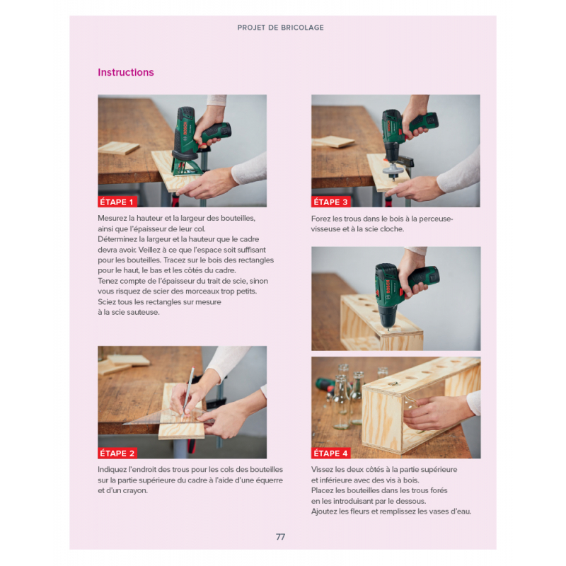 Le premier opus de cette collection est consacré au bricolage. Très en vogue actuellement aussi bien auprès des hommes que des femmes, le bricolage attire toutes les générations. Avec ce guide, percer un trou, suspendre une lampe, réparer une chaise, scier, poncer et peindre… deviendront un jeu d’enfant !