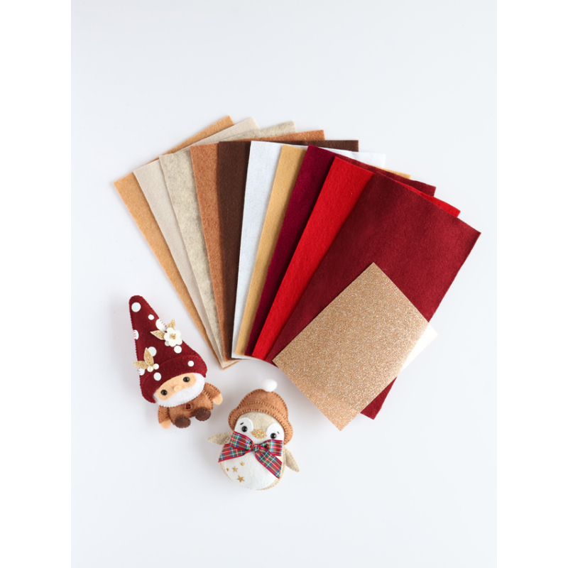 Avec leurs 20 feuilles de feutrine aux tons chauds et naturels et leurs feuilles de flex doré, ces kits complets vous permettront de réaliser toutes les décorations de Noël proposées dans les livres Un Noël enchanté en feutrine et Ma décoration de Noël en feutrine.