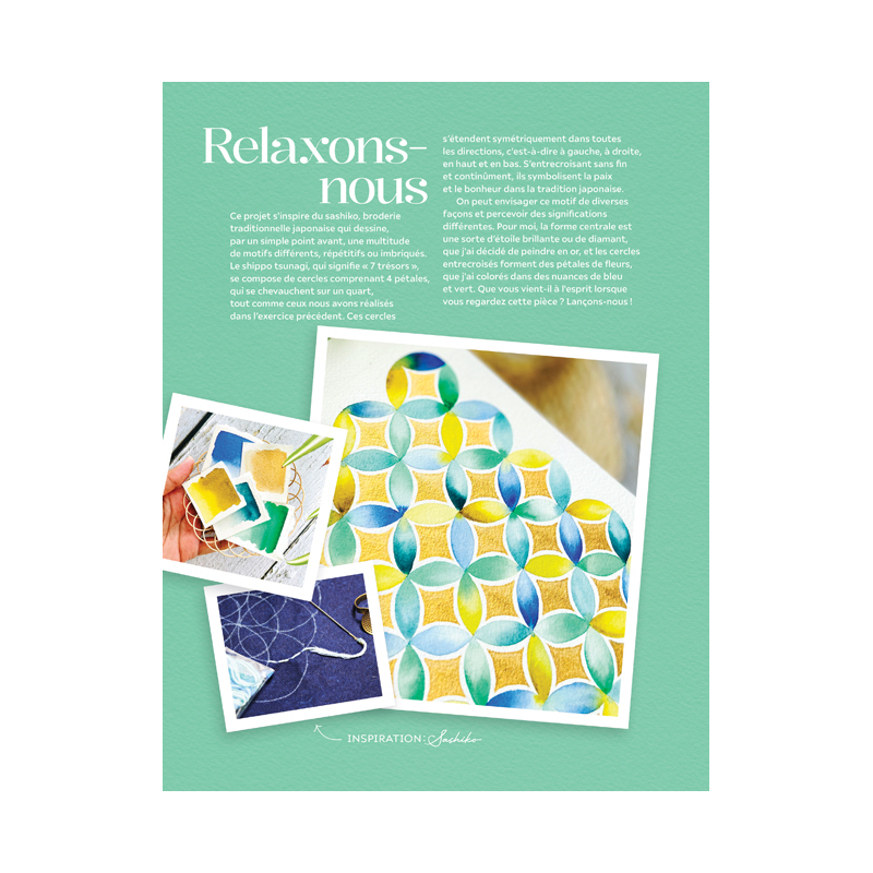 Au fil des 200 pages de ce livre aquarelle pour débutant, l’auteure vous invite à peindre des motifs répétitifs. Et ce, pour appréhender les techniques de peinture de manière relaxante via une approche progressive (hors de toute précipitation).
