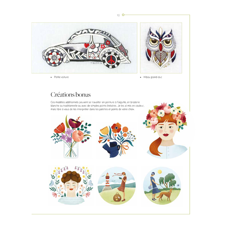 Le livre ne donne pas d’instructions concernant les points de broderie utilisés ni les coloris. En effet, l’auteure vous invite à laisser libre cours à votre imagination en vous inspirant librement des photos de chaque modèle de broderie. Il ne vous reste plus qu’à utiliser les transferts pour réaliser toutes sortes de projets DIY (tableau de broderie, quilting…).